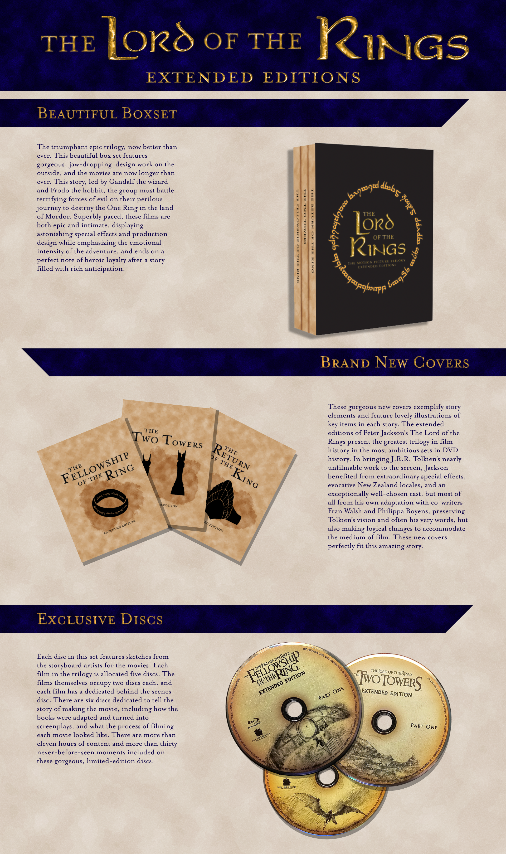 This project involved the creation of a kickstarter campagin. I redesigned the covers and package of the extended edition Lord of the Rings movies. Below there is a promotional video, social media posts, and other assets in support of the campaign.